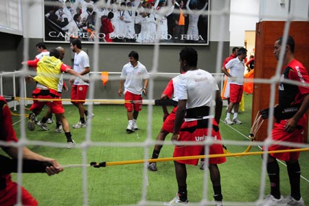 O grupo foi divido em quatro times de cinco componentes, e até mesmo o auxiliar técnico Leonardo Martins e o preparador Valenzuela participaram da movimentação. Dois times se enfrentavam enquanto os outros aguardavam. O rodízio de enfrentamentos era contínuo. Era permitido apenas dois toques na bola, e no terceiro a finalização a gol era obrigatória. Resumo: os goleiros trabalharam dobrado.