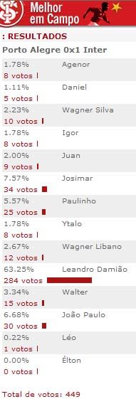 Destaque nas duas primeiras rodadas do Gauchão, o atacante Leandro Damião foi escolhido pelos internautas como o craque da partida contra o Porto Alegre. O jogador Inter B, que já havia marcado dois gols na estreia diante do Ypiranga de Erechim, mostrou oportunimso na partida realizada na última quarta-feira, em Canoas. Confira os números da enquete que foi feita no site colorado: