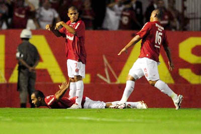 Alecsandro (no chão) marcou o gol da virada sobre o time equatoriano
