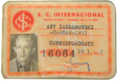 Ary foi jogador durante os anos 60 e 70. Tornou-se sócio do Inter, ainda como atleta, em 1962, dois anos depois de conhecer Helena. A categoria ‘Sócio Correspondente’ (foto abaixo) na sua carteirinha ilustra muito bem toda a trajetória do Internacional vista por ele. “Joguei no time de veteranos do Colorado e encerrei minha carreira ainda no Estádio Eucaliptos”, relembra Ary ao falar sobre a criação do Beira-Rio. O associado foi um dos contribuidores para erguer o Gigante. O Beira-Rio foi construído em grande parte com a contribuição da torcida, que trazia tijolos, cimento e ferro para a obra, inclusive do interior. Nesse sentido, havia programas especiais de rádio, para mobilizar os torcedores colorados em todo o Rio Grande do Sul. Consta que até Falcão, mais tarde ídolo colorado, chegou a trazer tijolos para a construção.
