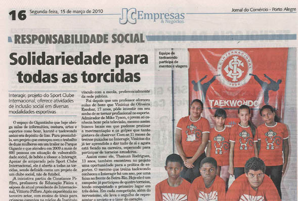 O Interagir recebeu destaque na edição do Jornal do Comércio desta segunda-feira. O serviço do projeto do Sport Club Internacional oferece atividades de inclusão social em diversas modalidades esportivas. As ações coloradas ganharam repercussão no jornal de Porto Alegre, mostrando que nem tudo é futebol no Beira-Rio.