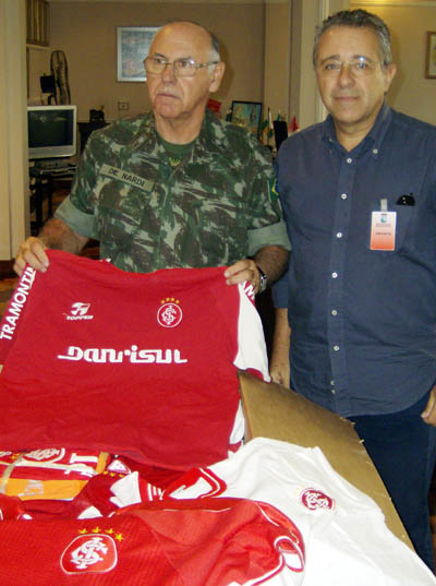 Foi entregue na tarde desta segunda-feira as 3.500 camisetas do Internacional que serão destinadas aos desabrigados do Haiti. As doações do Clube foram recebidas pelo Exército Brasileiro, representado pelo Gen. De Nardi, comandante do Comando Militar do Sul. As duas caixas com o material serão enviadas por aviões da FAB para Brasília e, de lá, partirão para o Haiti.