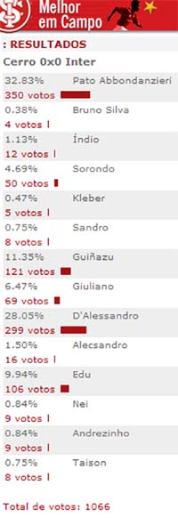 Foi uma votação dominada pelos argentinos do time do Inter. O goleiro Pato Abbondanzieri venceu a enquete do melhor em campo da partida contra o Cerro Montevideú com uma vantagem de apenas 51 votos em relação ao compatriota D'Alessandro. O capitão Guiñazu foi o terceiro mais votado. Veja os números: