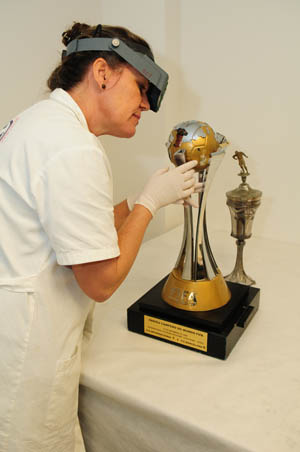 São cerca de 80 troféus que recebem este trabalho de restauração. Apesar do polimento e da limpeza, a funcionária que coordena o serviço, Susana Fernandez (foto ao lado), explica a necessidade de preservar as características originais das peças. “O principal critério de restauração que utilizamos foi de manter ao máximo os traços originais das obras. Assim, estes detalhes mostram o tempo que as taças têm”, esclarece Susana. Além disso, o museu ainda conta com 13 troféus revestidos de cobre, assinados por artistas europeus inclusive.