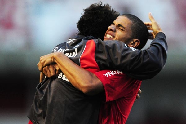 Taison comemora com Giuliano o primeiro dos seus dois gols contra o Universidade