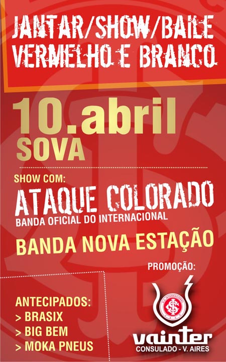 O consulado 'VAINTER', da cidade de Venâncio Aires, promove, para este sábado (10/04), um evento em comemoração ao aniversário de 101 anos do Internacional. Haverá janta, show e baile na Sociedade Olímpica Venâncio Aires (SOVA), com início às 20h A banda Ataque Colorado será a atração principal da noite, enquanto a banda Nova Estação será a responsável pela animação do baile.