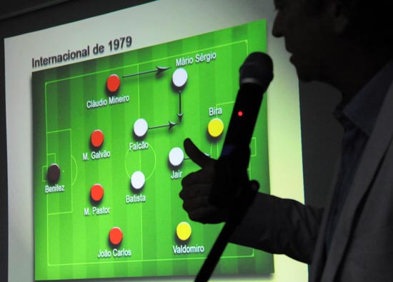 A continuação de seu pensamento levou às análises táticas dos clubes que defendeu. Falcão logo resgatou os times do Inter da década de 70, treinados por Rubens Minelli e Ênio Andrade. Anos em que o Internacional tornou-se tricampeão brasileiro. Auxiliado por gráficos, Falcão revelou o segredo daquelas equipes. Em seguida, já mostrou a formação tática do Brasil de 1982, a tão lembrada seleção de ouro eliminada pela Itália nas quartas-de-final da Copa do Mundo daquele ano. Um time que contava com Zico, Falcão, Júnior, Sócrates e outros grandes jogadores comandados por Telê Santana. “A grande surpresa deste fato foi consequência do que é o futebol. Acontece. Não faltou empenho; não faltou técnica. Tínhamos um excelente Brasil que não venceu. ‘Pior para os fatos’, como diria Nelson Rodrigues”, citou Falcão.