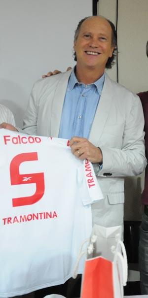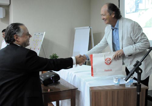 Fernando Carvalho entrega presente a Falcão pela palestra