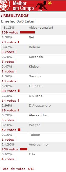 O goleiro colorado foi eleito pela quarta vez como o melhor jogador em campo na enquete promovida pelo site. A exemplo das partidas contra São Luiz, pelo Gauchão, e Deportivo Quito e Cerro do Uruguai, na Libertadores, Pato teve uma atuação destacada contra o Emelec na noite da última quarta-feira. Veja os números da votação desta partida: