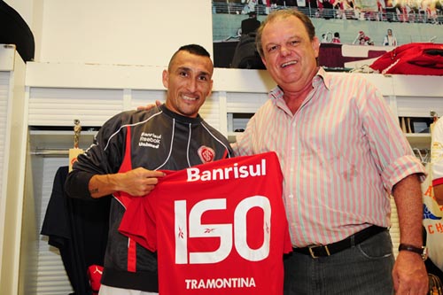 Guiñazu recebe de Vitorio Piffero camiseta comemorativa aos seus 150 jogos pelo Inter