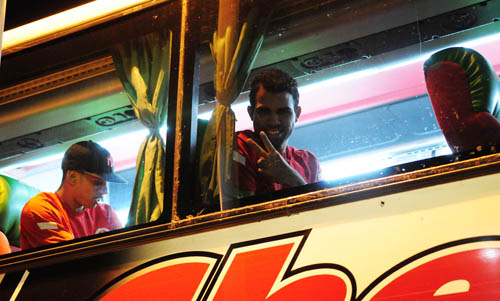 Sandro (C) faz sinal positivo na janela do ônibus que conduziu a delegação