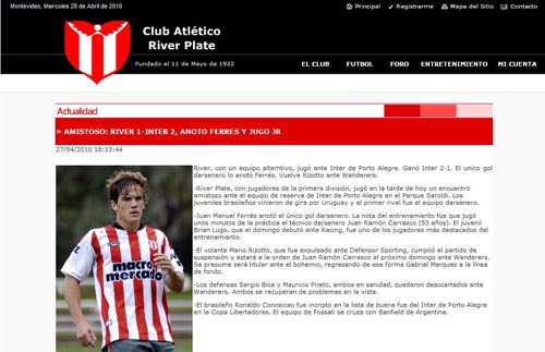 A excursão do Inter B pelo Uruguai começou com grande estilo. A equipe de Enderson Moreira entrou em campo na tarde desta terça-feira e venceu de virada o River Plate por 2 a 1, em amistoso realizado no Estádio Saroldi, em Montevidéu. Os atacantes Fabinho e Léo marcaram os gols colorados. O segundo tempo da partida contou com os titulares do grupo profissional do River. O próximo jogo ocorre nesta quarta-feira, às 15h30min, contra o Peñarol, no CT do clube uruguaio.