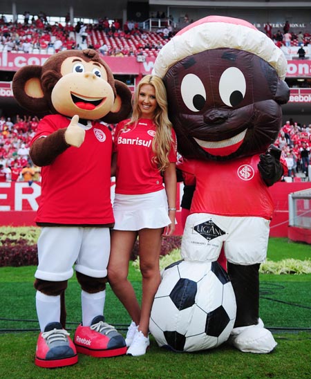 A representante do Inter no concurso Musa do Gauchão 2010, Rafaela Ribeiro, foi recepcionada por duas figuras especiais no Gre-Nal do último domingo (25/4), no Beira-Rio. A beldade desfilou à beira do gramado ao lado do Saci, mascote oficial do Clube, e do Escurinho, mascote dos projetos sociais desenvolvidos pelo Internacional. O 'Campeão de Tudo' está bem representado em qualquer situação, seja nos momentos com a Musa ou com os carismáticos mascotes!