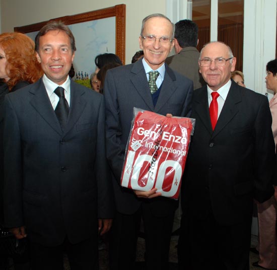 Roberto Juarez Guedes (E), ao lado de Enzo Martins Peri, que exibe a camiseta do Inter, e José Carlos De Nardi