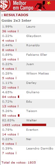 Ele comandou a reação colorada diante do Goiás, no Serra Dourada, marcando dois gols e sofrendo o pênalti que originou o gol da vitória anotado por Giuliano. Walter foi, sem dúvida, o grande nome da primeira vitória do Inter no Brasileirão. A vitória esmagadora na enquete do Melhor Jogador em Campo é o reflexo da grande atuação do atacante de 20 anos.