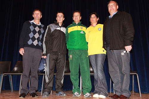 Rui Magalhães, o funcionário da FIFA que acompanha a Seleção Brasileira, ao lado de Dunga e os professores e diretores escola