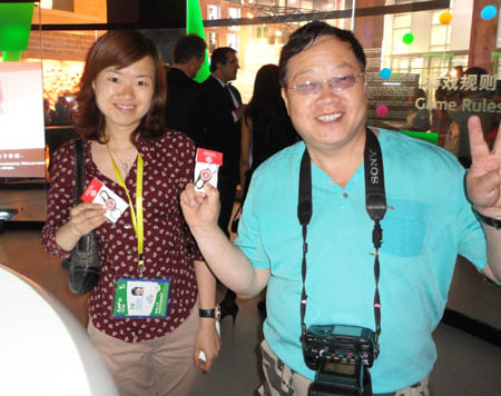 Presidente da Câmara de Vereadores de Porto Alegre Nelcir Tessaro com o DVD do Inter em frente ao estande de Porto Alegre na Expo Shangai, na China