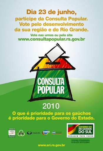 Mobilize a comunidade e escolha projetos que desenvolvam sua região participando da Consulta Popular que irá acontecer dia 23 de junho de 2010. Votar no crescimento do Estado - com finanças equilibradas e saudáveis - e na redução das desigualdades é compromisso de todo gaúcho. Obras, investimentos em áreas como Saúde, Segurança e Educação poderão ser conquistadas pelos gaúchos nesta votação, que é o processo de participação da sociedade na aplicação dos recursos por parte do Governo do Estado.