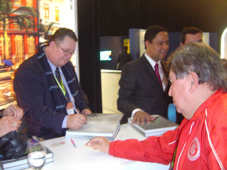 Os dirigentes do Inter prestigiaram, na última quarta (16/6), em Johanesburgo, o lançamento do livro 'Brasil de Todas as Copas. Emídio e Mussoi tiveram um exemplar autografado pelo autor Antonio Carlos Napoleão e pelo Ministro dos Esportes, Orlando Silva, que colocou a seguinte dedicatória na obra: "Ao Grande Sport Club Internacional, campeão de tudo, um abraço; Orlando Silva".