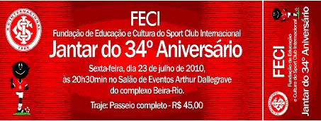A Fundação de Educação e Cultura do Inter (FECI) vai comemorar 34 anos de trabalho em parceria com o Sport Club Internacional na próxima sexta-feira, dia 23 de julho. Esta data é motivo de orgulho e alegria para todos os colorados, e para que esta comemoração seja perfeita, a Fundação conta com a sua participação.