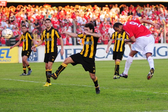 O primeiro lance de perigo da partida foi protagonizado pelo Inter, aos 2min: Giuliano fez jogada de efeito, driblou o marcador, e tocou para o lado, onde Alecsandro apareceu para chutar. O goleiro Sosa espalmou para escanteio. Ambos os times marcavam forte, diminuindo os espaços em campo. O Peñarol atuava com duas linhas de quatro na defesa, dificultando a penetração colorada. Por outro lado, o time uruguaio praticamente não ameaçava no plano ofensivo.
