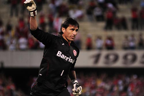 Pato Abbondanzieri sai para comemorar a defesa do último pênalti, que rendeu o troféu ao Inter