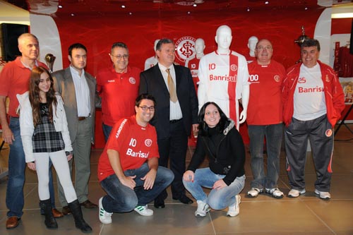 Dirigentes e sócios do Inter presentes posam com o manequim vestindo a nova camisa nº 3 do Inter