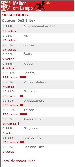A torcida colorada votou e Taison foi o eleito como o melhor jogador em campo na goleada do Inter contra o Guarani. Veja os resultados da enquete, que teve 1.057 votos.