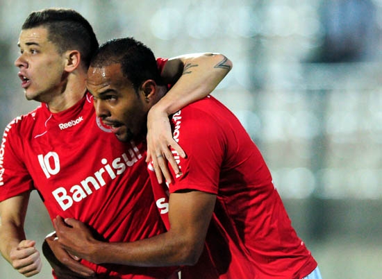Centroavante colorado (D) comemora com D'Alessandro seu primeiro gol