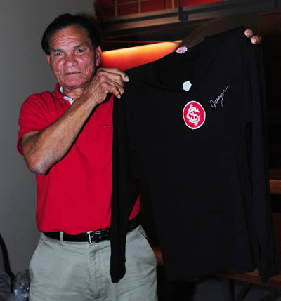 Antes da conversa, o goleiro bicampeão brasileiro em 1975 e 1976 recebeu uma homenagem do Clube: o Internacional lançou a camisa retrô de Manga, que remete à época em que o eterno ídolo colorado brilhou no Clube do Povo. O Marketing do Internacional também presenteou um participante da plateia com a peça que faz parte da coleção Ases Eternos.