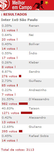 Pelo segundo jogo consecutivo, Taison foi apontado pela torcida colorada como o melhor jogador em campo. Dessa vez, a partida em questão foi a semifinal contra o São Paulo, no Morumbi. O atacante recebeu 1271 votos, e foi seguido de perto por D'Alessandro, que teve 982 votos. Confira os números da votação: