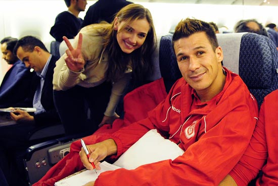 Zagueiro Índio concede autógrafo para a torcedora no avião