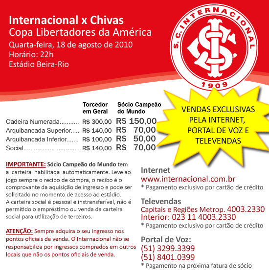 Ingressos para Inter x Chivas Guadalajara (Libertadores) podem ser comprados pelo canal. Ligue!