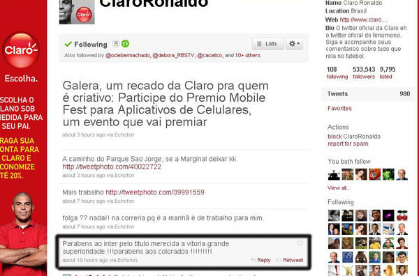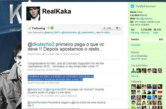 O bicampeonato da América ecoa por todo o mundo. Dois grandes jogadores do futebol brasileiro utilizaram o twitter para prestar homenagem ao título do Internacional. O meia Kaká, que está atualmente no Real Madrid, da Espanha, conta com mais de um milhão de seguidores e nesta quinta-feira pela manhã postou a seguinte mensagem aos colorados: “Parabens ao Inter, e a todos os colorados pelo titulo da Libertadores!! Final do mundial Inter x Inter??”.