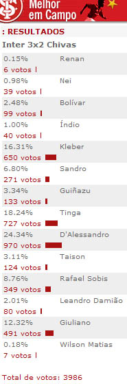 O meia-argentino recebeu 24.34% dos votos na enquete promovida pelo site, sendo escolhido como o melhor jogador em campo da final da Libertadores 2010.