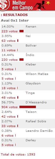 O meia argentino vem tendo atuações destacadas, tanto que já havia sido eleito como o melhor jogador em campo nas duas partidas da decisão da Libertadores contra o Chivas, em enquete realizada pelo site. Na vitória de 1 a 0 sobre o Avaí, na Ressacada , pela 16ª rodada do Brasileirão, D'Alessandro apresentou novamente um grande futebol e foi escolhido pelos internautas como o melhor do jogo de forma esmagadora. Confira os números da votação: