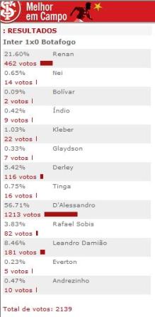 Mais de dois mil votos dos internautas aqui no site oficial do Inter elegeram o meia D'Alessandro como o grande destaque da vitória colorada contra o Botafogo no último sábado. Veja a enquete completa.