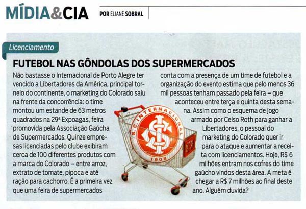 A presença do Internacional na 29ª Expoagas – Convenção Gaúcha de Supermercados, em Porto Alegre, foi motivo de elogios por parte da Revista Isto É. Afinal, foi o primeiro Clube de futebol a instalar um estande na feira, exibindo produtos colorados licenciados. A matéria parabeniza o marketing do Inter pela iniciativa.