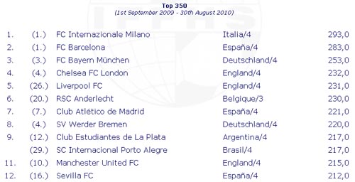 A conquista do bicampeonato da Taça Libertadores da América não para de render frutos ao Inter. O ranking da Federação Internacional de História e Estatística do Futebol (IFFHS) foi atualizado nesta quarta-feira e divulgado por meio de seu site oficial. O Sport Club Internacional, que ocupou a 29ª colocação no mês de agosto, deu um grande salto e agora está na 9ª posição, com 217 pontos, ao lado do Estudiantes de La Plata, da Argentina. É o clube brasileiro mais bem colocado na lista das 350 equipes do mundo.