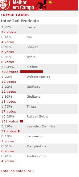 A galera colorada votou e Kleber foi eleito o melhor em campo na vitória do Inter sobre o Grêmio Prudente por 2 a 0, no Beira-Rio. O lateral-esquerdo colorado foi autor das duas assistências que resultaram nos gols da vitória.