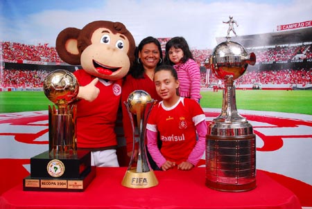 Escurinho atende ao pedido de fotos junto às gloriosas taças da Libertadores (D), Mundial (C) e Recopa (E)