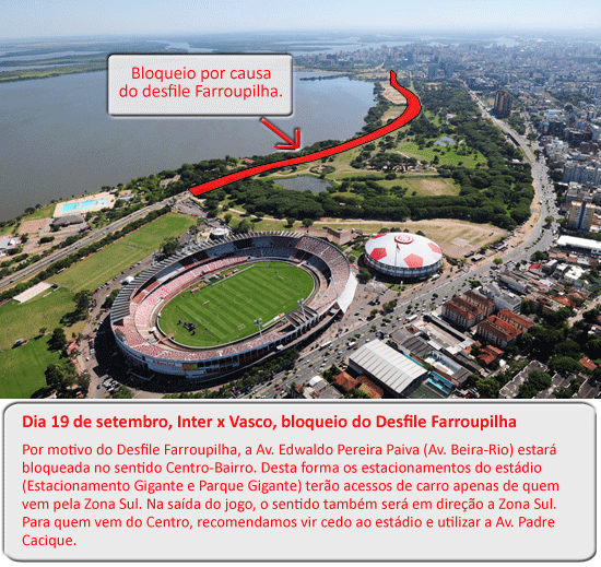 Torcedor colorado, fique atento com as alterações no acesso ao estádio Beira-Rio, pela Avenida Edwaldo Pereira Paiva, para o jogo de Inter e Vasco da Gama. A partida é válida pelo Campeonato Brasileiro. Haverá um bloqueio na avenida em virtude do Desfile Farroupilha, em comemoração ao dia 20 de setembro.