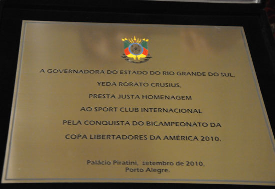 Após a homenagem recebida na Assembleia Legislativa do Rio Grande do Sul, o presidente do Sport Club Internacional Vitorio Piffero e dirigentes seguiram para o Palácio do Governo do Estado, onde foram recebidos pela governadora Yeda Crusius. Das mãos da governadora foi entregue a Piffero, uma placa em honraria ao título da Libertadores da América de 2010.