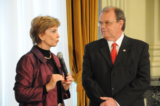 Governadora Yeda Crusius (E) e o presidente Vitorio Piffero durante homenagem ao bicampeonato da América