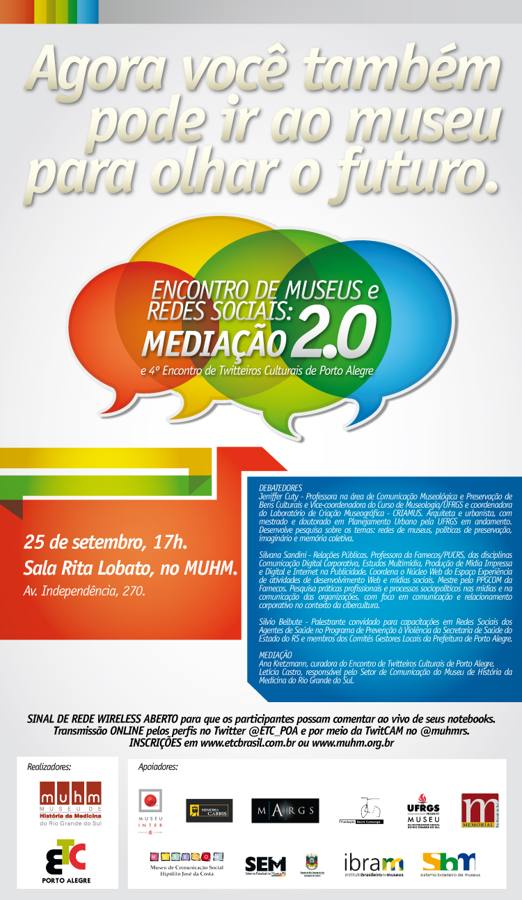 O “Museus e Redes Sociais: Mediação 2.0” é uma realização do Museu de História da Medicina do Rio Grande do Sul juntamente com o apoio dos Museus de Porto Alegre. E para contrariar o dito popular “quem gosta de passado é museu”, no local haverá sinal aberto da rede wireless para que os participantes possam comentar ao vivo dos seus notebooks e os participantes poderão enviar seus comentários online pelo perfil no twitter @ETC_POA e poderão assistir ao evento por intermédio da twitcam do @muhmrs.