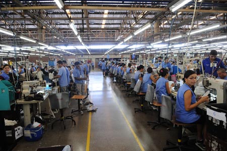 Grupo colorado recebido por representantes da Reebok na fábrica
