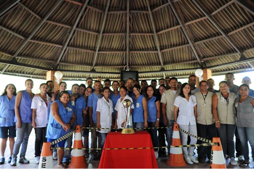 Pessoal aproveitou para tirar fotos com a taça do Mundial FIFA