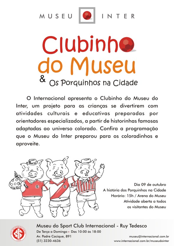 Quer coisa melhor que comemorar o mês das crianças mostrando a seu filho como é bom ser Campeão de Tudo? É só vir no Museu! Todos os coloradinhos estão convidados a participar da 3ª edição do Clubinho do Museu do Inter! Neste sábado, dia 08, contaremos a história dos Três Porquinhos que, de tão apaixonados por futebol, resolvem montar seu próprio estádio. Após a Contação de História, haverá atividades de colorir e brincadeiras para todas as idades. Participe!
