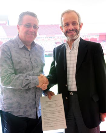 O departamento de marketing do Internacional comemorou na tarde desta quarta-feira (13/10) uma nova parceria comercial. A rede de farmácias Panvel assinou convênio com o Clube, que visa diversos benefícios para os sócios colorados, como o desconto na aquisição de remédios e perfumaria. O documento foi assinado nas suítes do Beira-Rio pelo diretor executivo de marketing do Inter, Jorge Avancini, e pelo diretor da rede Panvel, Luiz Antônio Damado dos Santos.