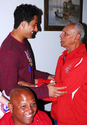 Lauro (E) se encontra com o ex-goleiro Milton Vergara durante a festa